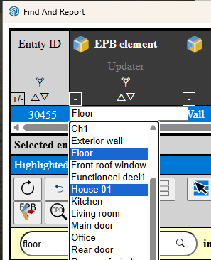 When no element is selected, the 4 EPB columns in Find And Report act as filters on the list of EPB elements.