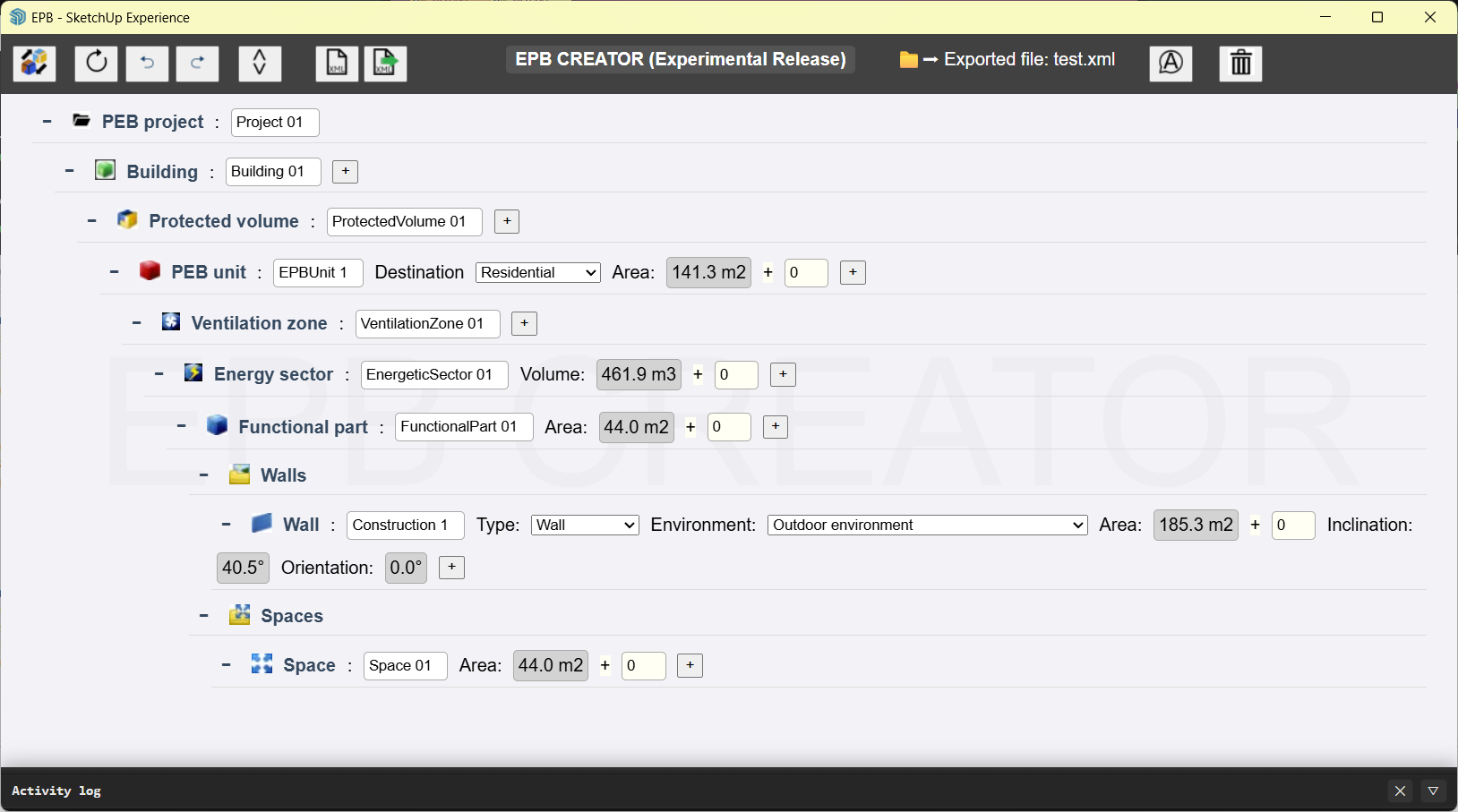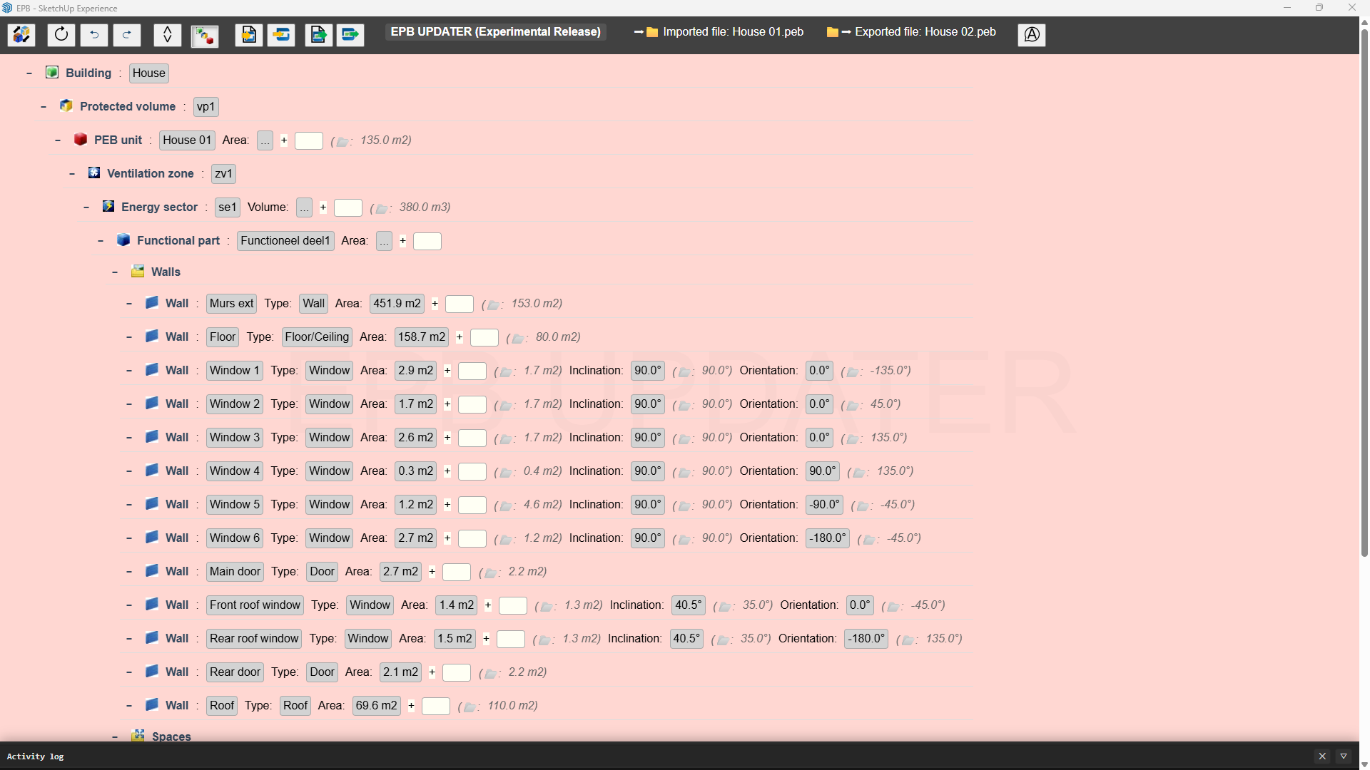 - De informatie over oppervlakte, volume, oriëntatie, helling wordt in het EPB-bestand geïmporteerd.