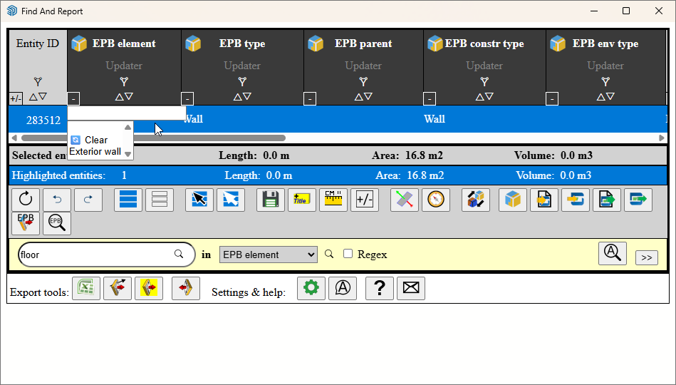 Wanneer nog geen element is geselecteerd, dienen de 4 EPB-kolommen in Find And Report als filters op de lijst van EPB-elementen.